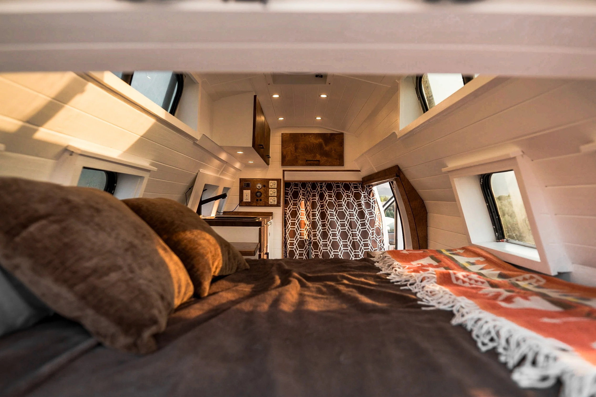 COMING FROM BUILDING SOLELY ON NEWER VANS WITH FULL METAL FRAMING TO TIE INTO, THIS BUILD WAS AN AMBITIOUS DEPARTURE FROM EVERYTHING I’D DONE BEFORE. WITH A 24” FIBERGLASS LID WITH NO WOOD/METAL TIE IN POINTS, I HAD TO GET CREATIVE TO MAKE IT GO, BUT MAN, DID IT EVER GO. I’VE NEVER BUILT SO MANY WILDLY SHAPED WINDOW FRAMES OR SCRIBED AS MANY TRICK CUT PIECES AS I HAVE ON THIS VAN. TRULY A ONE OF A KIND AESTHETIC AND VIBE THIS VAN BRINGS TO THE TABLE, WHICH I WAS HAPPY TO BRING TO LIFE. IN A WORLD OF REVELS, STORYTELLERS AND OTHER HIGH END SPRINTER BUILDS, BE A FANCY CUSTOM 97 ECONOLINE.