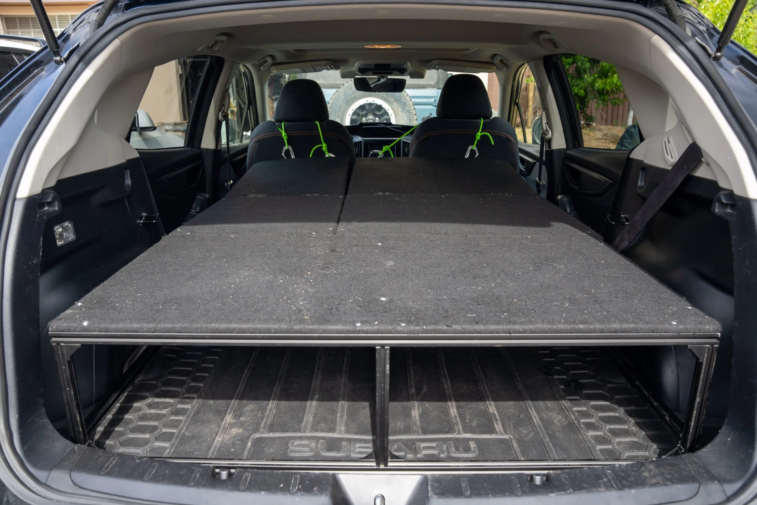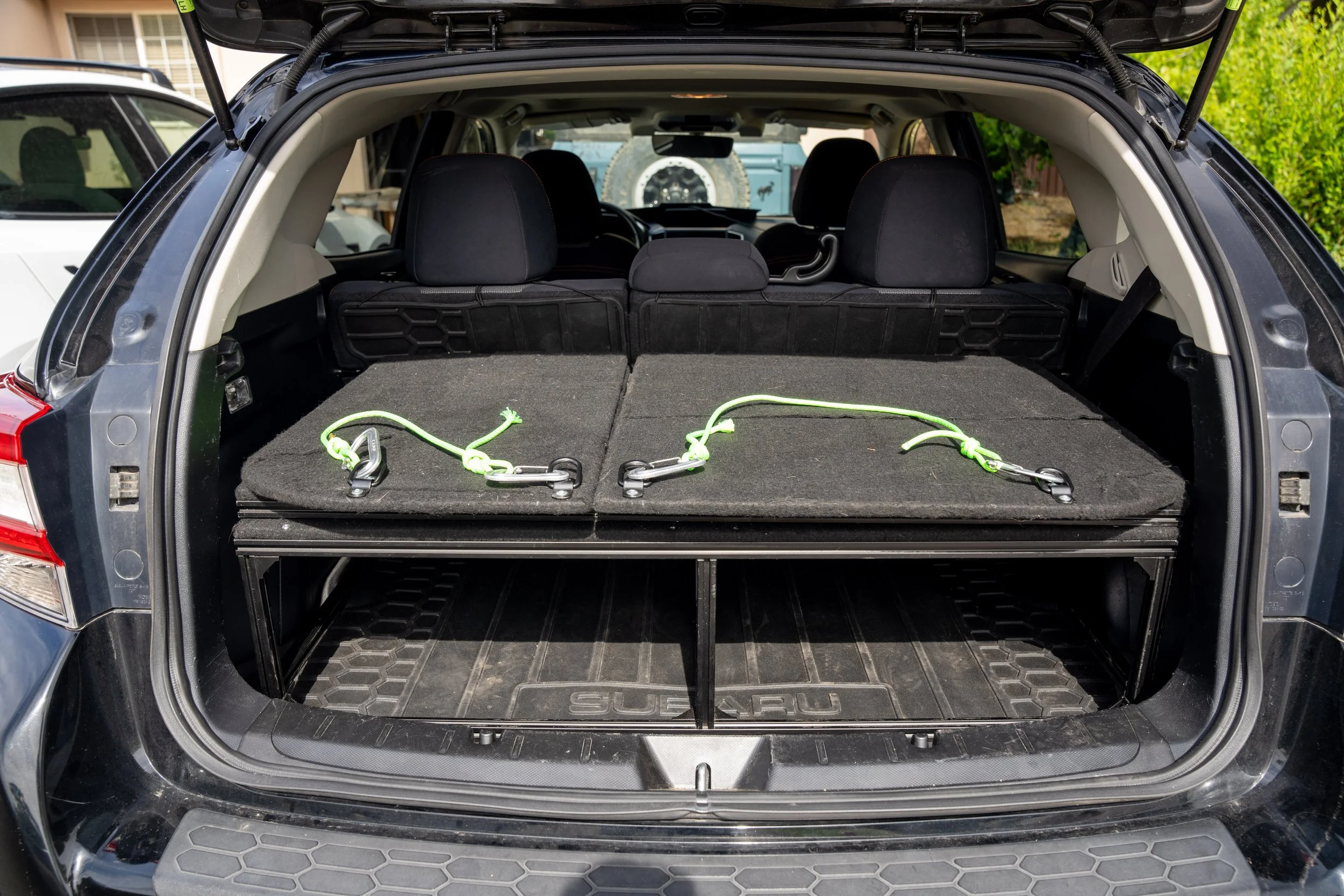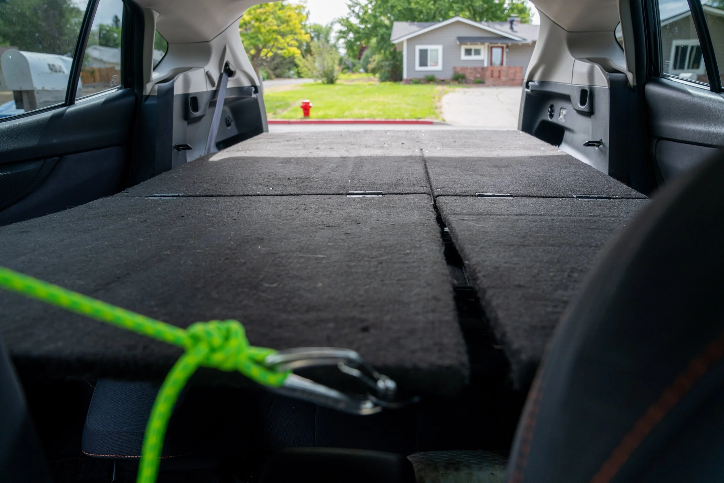 WITH A 10 DAY AMERICAN MOUNTAIN GUIDE ASSOCIATION TRAINING COURSE COMING UP AND MY VAN IN THE SHOP ALL MONTH, I HAD TO SCRAMBLE TO FIGURE OUT A SLEEPING SOLUTION FOR THE COURSE. NOT ONLY WOULD IT BE CHALLENGE TO FIGURE OUT HOW TO FIT MY 6' LONG BODY IN THE MOST COMPACT SUBARU AVAILABLE, BUT I NEEDED A SLEEPING SOLUTION THAT WOULD BE COMFORTABLE AND SUSTAINABLE FOR THE LENGTH OF THE COURSE. NOT TO MENTION, SOOOOO MUCH GEAR NEEDED TO GO WITH ME FOR THE TRIP. MY DESIGN NOT ONLY WORKED, BUT FAR EXCEEDED MY EXPECTATIONS. I'M HAPPY TO SAY THROUGH THAT EXPERIENCE I'VE CREATED AN INCREDIBLY EFFICIENT AND LIGHTWEIGHT MODULAR STORAGE/SLEEPING FRAME KIT. THIS SYSTEM WORKS FOR THE SUBARU CROSSTREK, BUT IS OPTIMIZED FOR THE FORESTER AND OUTBACK, WITH THEIR FLUSH CARGO FLOOR AND REAR DOOR LATCH.