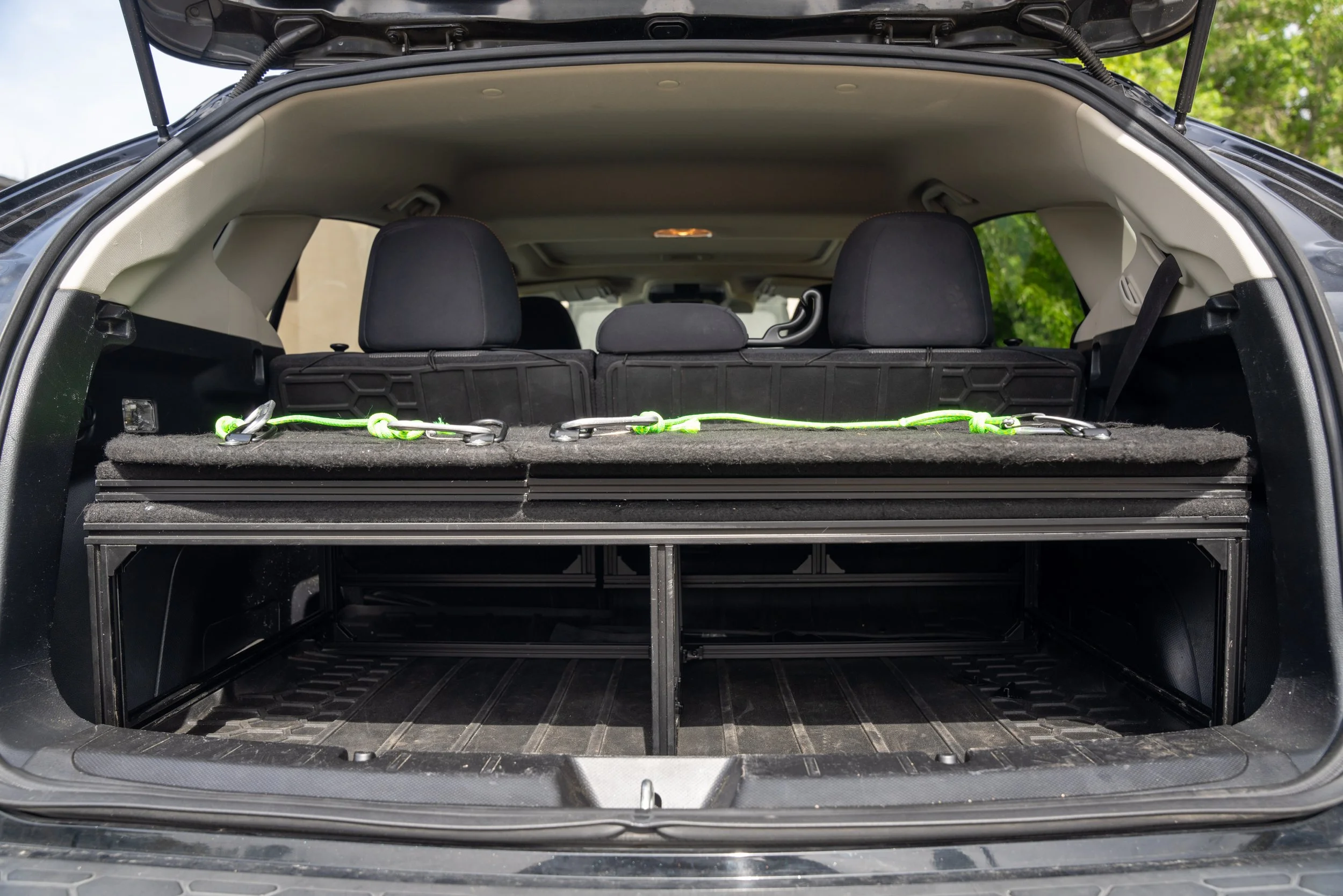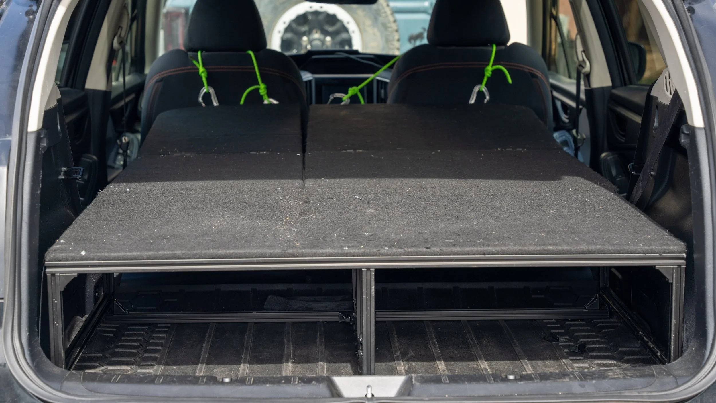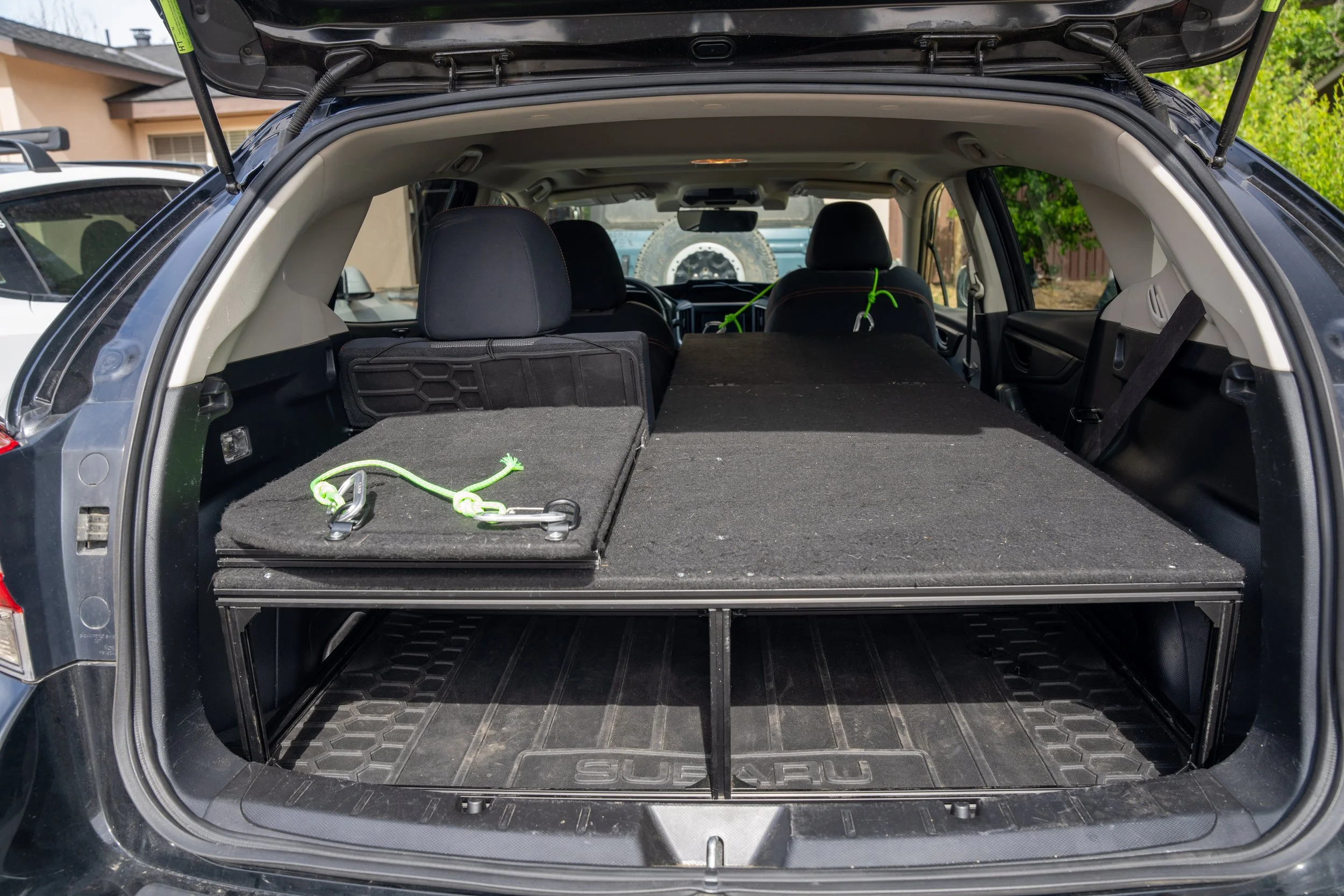 WITH A 10 DAY AMERICAN MOUNTAIN GUIDE ASSOCIATION TRAINING COURSE COMING UP AND MY VAN IN THE SHOP ALL MONTH, I HAD TO SCRAMBLE TO FIGURE OUT A SLEEPING SOLUTION FOR THE COURSE. NOT ONLY WOULD IT BE CHALLENGE TO FIGURE OUT HOW TO FIT MY 6' LONG BODY IN THE MOST COMPACT SUBARU AVAILABLE, BUT I NEEDED A SLEEPING SOLUTION THAT WOULD BE COMFORTABLE AND SUSTAINABLE FOR THE LENGTH OF THE COURSE. NOT TO MENTION, SOOOOO MUCH GEAR NEEDED TO GO WITH ME FOR THE TRIP. MY DESIGN NOT ONLY WORKED, BUT FAR EXCEEDED MY EXPECTATIONS. I'M HAPPY TO SAY THROUGH THAT EXPERIENCE I'VE CREATED AN INCREDIBLY EFFICIENT AND LIGHTWEIGHT MODULAR STORAGE/SLEEPING FRAME KIT. THIS SYSTEM WORKS FOR THE SUBARU CROSSTREK, BUT IS OPTIMIZED FOR THE FORESTER AND OUTBACK, WITH THEIR FLUSH CARGO FLOOR AND REAR DOOR LATCH.